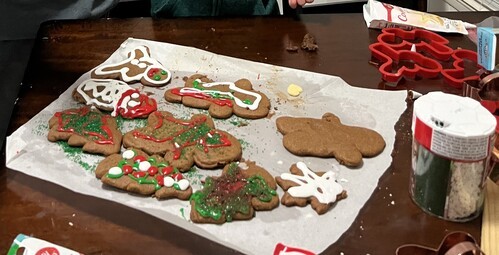 Grandma is in town this week so last night we baked and decorated a bunch of Christmas cookies for our immediate neighbors to hand out today. Of course, cooking with small children is always interesting and challenging but for the most part, he did a much better job listening this year than he did last year when we made Christmas cookies for the family. Some of them look like a bit of a mess, but I’m blaming the tube the frosting came in and not just user age or user error.