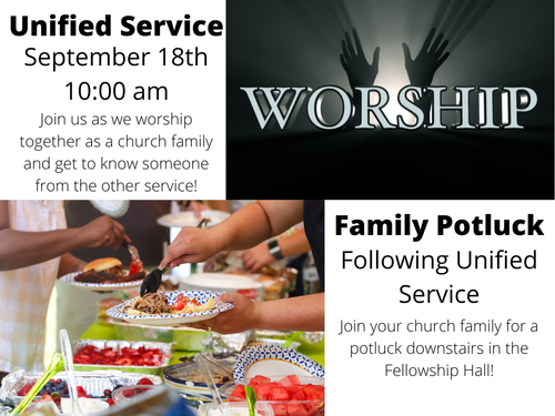 Join us on September 18th at 10:00 am for our Unified Service. This service gives us a chance to worship all together as a church family honoring both styles of worship. Take this opportunity to get to know someone from the service you don't normally attend.