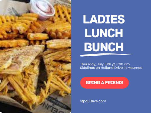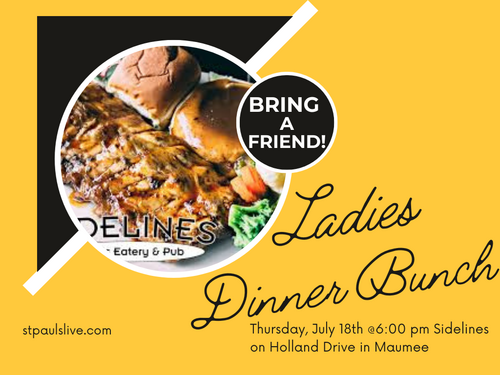 Ladies of all ages are invited to meet on Thursday, July 18th, at 6:00 pm at Sidelines on Holland Drive in Maumee, to enjoy good food and good company together. Bring a friend!